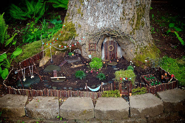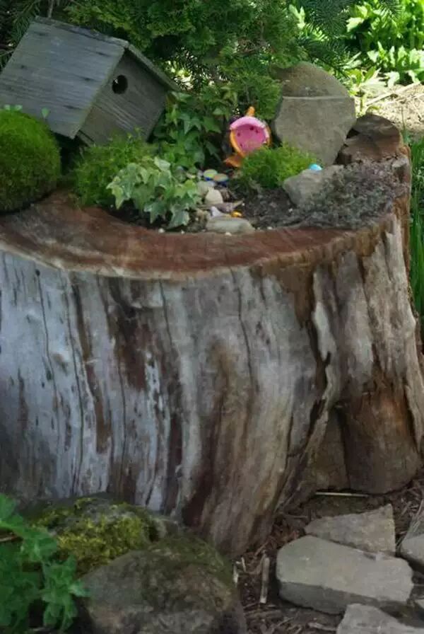 大树桩不用?用土、小房子、和植物填满它。